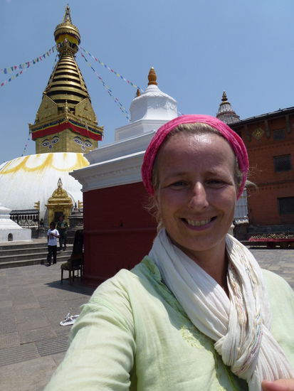 Und dann rauf durch eine Art Park am Hang, zwischen Gebetsmühlen, kleinen Stupas, Souvernirverkäufern, Affen, Einheimischen und Touristen (ich muss aber sagen, es waren keine Horden von Touris hier, verwundert mich). Tja und dann war er da, Buddhas Blick mit dem dritten Auge. Wundervoll, das Wetter war gnädig und der Tempel zeigte sich von seiner schönsten Seite. Schön, hier zu sein und alles in Natura anschauen zu können und nicht, wie bisher auf Bildern. Es dauerte nicht lange, da kriegte ich auch schon von einem Mönch mein Glücksbändchen und dann habe ich mal erst den Tempel vorwärts und rückwärts mit ganz viel Zeit erkundet. Hier war es so herrlich ruhig, keine Gehupe und Gequietsche. Ganz oft hörtest du Om Mani Padme hum, ein buddhistisches Gebet und das gab dem ganzen noch ein I-Tüpfelchen oben auf. Ich habe mich sehr wohl gefühlt und viele Bilder gemacht, die folgen werden. Nach diesem Tempel wollte ich eigentlich noch zum Bodnathtempel etwas außerhalb, aber ich hatte keine Lust, mich wieder in dieses Verkehrschaos da draußen zu stürzen, also ganz viel Zeit gelassen, gemächlich wieder zurück zum Hotel, zwischendurch noch bei einem Schneider gehalten, die zweite Hose enger nähen lassen und dann mal erst ein wenig Ruhe im Hotel, die schönen Bilder vom Tempel auf den PC gezogen und dann viel es mir plötzlich ein...........