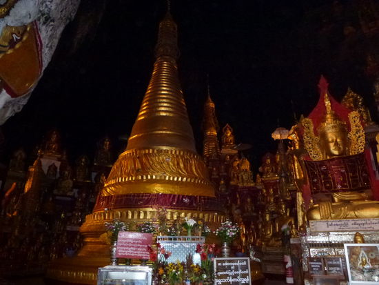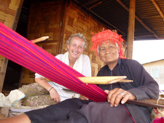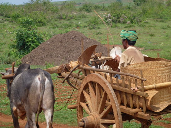 Unser Koch ging bereits schneller los, denn er kaufte in den Dörfern, wo wir hielten, frisch ein und bereitete unser Essen frisch zu. Die erste Wegstrecke ging vorbei an Reis-und Erdnussfeldern, Ochsenkarren und Landarbeiter. Überall winkten uns die Menschen fröhlich zu oder fragten, wo wir her kamen. Eine kurzen Zwischenstopp hatten wir in Pin Nwe bei den Pa Oh Frauen. Eine alte Dame webte gerade die hier typischen Taschen für die Enkelkinder, da diese bald Schulanfang hatten, ich fand es sehr interessant und habe jetzt eine solche Tasche als Erinnerung. Ist schon toll zu sehen, wie diese alte Dame den Stoff selbst webt und verarbeitet. Die Kinder fanden das Display von den Fotoapparaten viel interessanter. Nach dem wir auch nett Tee getrunken haben, ging es weiter nach Kone Hla, wo wir Lunch hatten. Es gab eine Suppe vorweg, gebratene Nudeln und Mangos. Es war das beste Essen, was ich bis dahin in Birma hatte. Während der Pause setzte auch monsumartiger Regen ein und wir waren froh, ein Dach über den Kopf zu haben. Nachdem der Regen aufgehört hatte, ging es weiter, allerdings etwas beschwerlicher, da der Lehm förmlich unter unseren Füßen klebte. Unterwegs trafen wir auf Männer, die aus Steinen Kalk bzw. Kalcium herausholten, indem die Steine lange erhitzt werden und dann zerkleinert. Dieses weiße Zeug wird hier z.B. mit der Bethelnuss gekaut. Dann kamen wir an einem super kleinen tiefen Schacht, wie vor hundert Jahren das Ruhrgebiet..... unten drin ein Mann, oben ein Mann und sie förderten Karbon zu Tage. Pechschwarz wie die Nacht, kann kein gesunder Job sein... und der Kilopreis für das Karbon liegt in Yangon bei ganzen 5 Cent, und davon müssen sich Zwei samt ihrer Familie ernähren...!!!!!