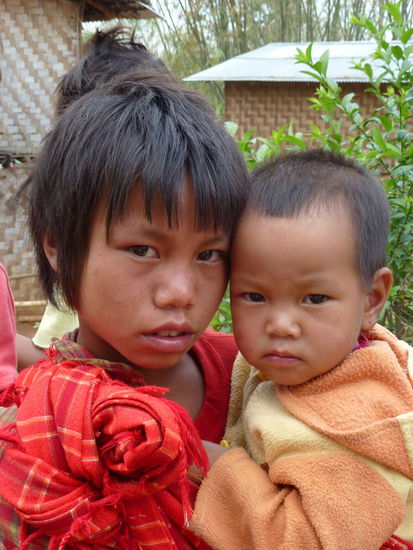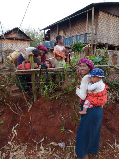 Dieses Dorf war kein Touristenfake, dieses Dorf ist real, ist Alltag der Bergbewohner und war so wunderbar. Die Kinder und auch die Erwachsenen fanden es so toll, sich fotografieren zu lassen und waren so erstaunt, sich dann auf dem Display zu sehen. Und die Kinder lernen ganz schnell, wie man sich die ganzen Fotos anschaut und mögen gar nicht aufhören. Nachher war das halbe Dorf um den Fotoapparat versammelt. Die glänzenden staunenden Augen.............das hat einem einfach so sehr das Herz geöffnet. Wir konnten uns gar nicht losreißen, doch vor dem Dunkelwerden mussten wir dann in unser Gästehaus und dann wurde mal erst fürstlich bei Kerzenlicht getafelt. Ich weiß nicht, was unser Koch alles aufgetischt hat, aber es war ein Traum. Soooooooo lecker! Wir haben viel erzählt und gelacht und unsere Toto war wirklich die richtige Wahl, es war einfach nur schön, sie als Guide dabei zu haben. Nach einer verdammt harten Nacht, wo auch immer wieder die Katzen des Hauses auf einem rumgeklettert sind, gab es um 05.30 Uhr frühstückt, traumhafte Pfannkuchen mit frischen Obst und dann ging es weiter Richtung Inlay Lake. Die Landschaft heute war nicht so eine liebliche Hügellandschaft, einige Zeit ging es über eine unbefestigte Straße, aber aufgemuntert wurden wir immer wieder durch winkende staunende Kinder oder Frauen, die uns auf dem Weg ganz wunderbar duftende Blumen schenkten oder aber Feldarbeiter, die uns zuwinkten. Zwischendurch hatte ich echt Tränen in den Augen, so sehr hat mich diese Trekkingtour und dieses Eintauchen in das wahre Dorfleben berührt.