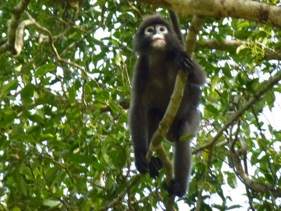 Zurück an Bord durften wir uns wieder mit Obst und Getränken stärken und es ging weiter zu einer kleinen Trauminsel...Koh Wua Talap....oh gott, ist das ein Traumstrand. Es stand dann zur Wahl, ob man zu einem Viewpoint möchte, zu einer Höhle oder einfach nur baden. Höhle stand auf dem Plan, in der Annahme, dass es dort ja schön kühl ist.........ha, weit gefehlt, mal wieder ein super anstrengender Aufstieg, überwiegend am Seil (manchmal frage ich mich, warum ich immer irgendwo rumkraxeln muss). Die beiden Höhleneingänge boten einige nette Stalagmiten und Stalagtiten und waren ganz ok., den Weg zum Viewpoint haben sich alle aufgrund der Hitze gespart, die sich dann aber schnell mit einem Gewitterguss ablöste und einen wunderbaren Regenbogen zauberte. In manchen Gegenden auf der Welt ist sogar Regen schön! Aber das Highlight auf der Insel, die auch Monkeyisland genannt wird, sind die dort lebenden Brillenlanguren..................einige habe ich so wunderbar vor die Kamera bekommen, das war so toll! Habe ich schon erwähnt, dass ich meine kleine superschnelle und superzoom Kamera absolut liebe?!