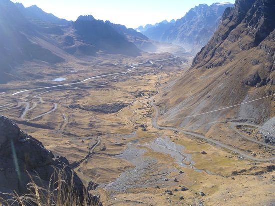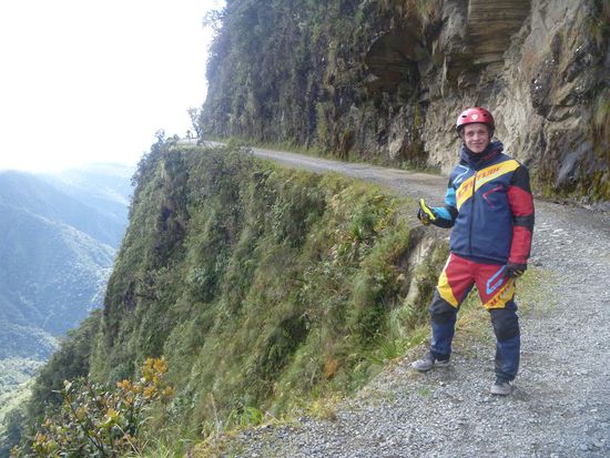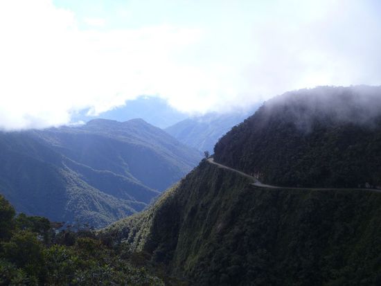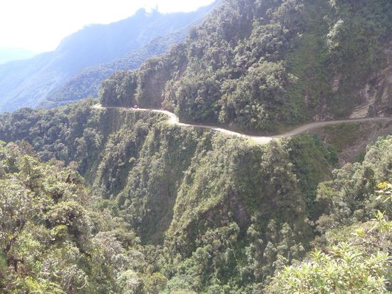 Unglaublich, dass sie bis 2006 die einzige Verbindung von La Paz in den Dschungel nach Coroico war - mit Verkehr in beiden Richtungen. Gefahren wird hier auf der linken Seite, damit die Fahrer naeher an der Klippe sind um den Abgrund zu sehen.