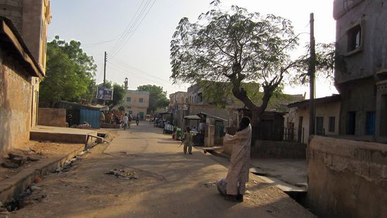 Apropos Höhepunkt. Der geografische Höhepunkt der Stadt ist der Dala Hill. Er ist gleichzeitig auch der Ursprung der Stadt Kano, welche daher auch bis zum Beginn des 15. Jahrhunderts als Dala in die Geschichte einging. Mohammed wählt dorthin einen Weg, auf dem noch gut erhaltene Reste der alten Stadtmauer zu sehen sind. Der Großteil der in traditioneller Lehmbauweise erstellten Stadtmauer ist jedoch stark verfallen. Das hat im Wesentlichen zwei Ursachen: zum einen die wetterbedingte Erosion und zum anderen das mangelnde Bewusstsein der Einwohner für Kultur und Historie. Der Lehm der Mauer ist von hoher Qualität und findet daher zunehmend anderweitige Verwendung. Ein Teil der Mauer wird derzeit mit deutscher Hilfe wieder restauriert, erklärt mir Mohammed. Der Dala Hill ist 534 Meter über dem Meeresspiegel, etwa 50 Meter über der Stadt und kann über etliche Stufen erreicht werden. Ein fantastischer Panoramablick über die ganze Altstadt entschädigt jedoch für alle Mühen.