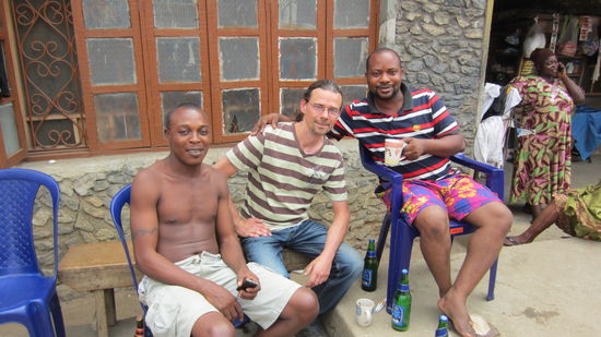 Während ich grübele, was ich noch so anstelle, treffe ich auf ein paar Jungs, die gelangweilt auf der Terrasse eines Shops herumlungern: Seye, Edwin, Wallex und Small; die anderen Namen kann ich nicht behalten. Die Spezies Mensch mit meiner Hautfarbe ist zwar in Lagos beileibe nicht unbekannt, aber in Surulere dürfte sie nicht allzu oft vorkommen. Sie wollen mit mir reden, Fotos machen und laden mich schließlich zu einem Bier ein. Nach einer ausgiebigen Fotosession schlagen sie vor, gemeinsam in eine Bar zu gehen. Ich weiß, dass ich die ganze Bande jetzt zu einem Bier einladen muss. Alternativ kann ich mich aber auch alleine durchschlagen und mit meinen paar Naira vereinsamen. Ich zähle mal durch; wir sind zu siebt, das wird teuer. Doch ich habe die Rechnung ohne die nigerianische Gastfreundschaft gemacht. Ich werde den ganzen Tag eingeladen und bezahle am Ende keinen einzigen Naira. Ich meine, das ist hier kein Slum aber wirklich wohlhabend ist keiner, der in Surulere lebt.