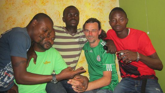 Irgendwann erwähne ich mal, dass ich mir noch ein Trikot der nigerianischen Fußballmannschaft als Souvenir mitnehmen will. Wallex, der zufällig eines an hat, hat dafür eine ganz pragmatische Lösung parat und gibt mir seines im Tausch gegen mein T-Shirt. Die Jungs hier sind echt völlig durchgeknallt. Die Nigerianer sind fußballverrückt wie kaum ein anders Land in Westafrika und Mitte des Monats steht der African Cup of Nations an, doch zu aller Enttäuschung konnte sich der zweifache Afrikameister Nigeria erstmals seit 1974 nicht qualifizieren.
