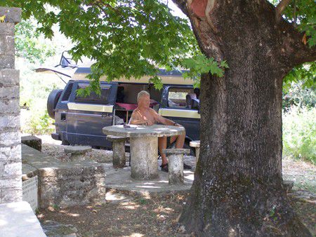 Nachdem wir den ersten großen Pass überwunden haben, machen wir Rast bei einem Kirchlein, vor dem sich unter einer schattigen Platane ein Brunnen mit einer aus Baumstämmen gezimmerten Sitzgruppe befindet. Wir finden auf der Bank einen kleinen Plastikelefanten und beschließen, ihn als Glücksbringer zu adoptieren. Warum nicht gleich hier die Nacht verbringen?