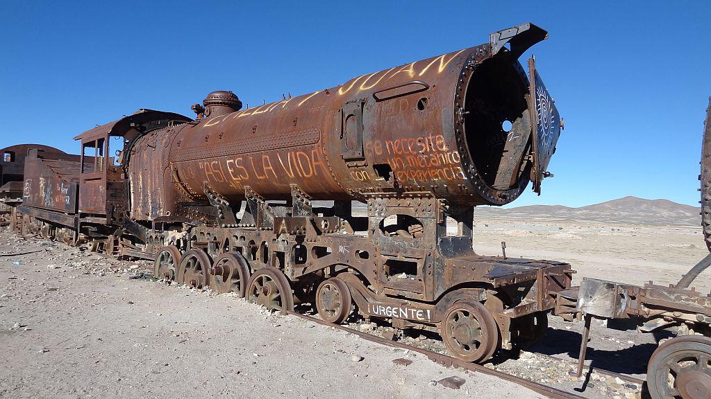 Das Frühstück wurde gegen 8 Uhr gereicht. Brötchen, Butter und Erdbeermarmelade. Tee und Instant Kaffee zum aufwärmen. Apropos aufwärmen. Die Temperatur fiel in der Nacht auf -10°C berichteten uns die Fahrer. Man konnte es an den Fenstern der Jeeps noch sehen. Grosse Eiskristalle zierten die Fensterscheiben Ich beschloss um 6:30 aufzustehen und den Sonnenuntergang zu beobachten. Die Holländer und Argentinier warteten bereits im zugefrorenen See. Ein See, in dem vor 12 Stunden noch Flamingos wanderten. Der See war natürlich nicht komplett zu gefroren, sondern nur die Pfützen und der Rand. Aber es war ein beeindruckendes Schauspiel. Der 2te Tag verlief ähnlich aufregend wie der erste. Nur dass es durch Steinwüste ging und mein Rücken langsam anfing wehzutun. Ich sass, oder lag immer noch auf der Rückbank. So hatte ich den meisten Platz, konnte mich aber nicht aufrecht hinsetzen. Zum Mittagessen ging es erstmals in ein Bolivianisches Dorf. Hier kehrten wir bei einer Bolivianischen Familie ein. Sofort fielen die bekannten Hüte auf, die jede Frau hier trägt. Zu essen gabe es Suppe, Reis, Kartoffeln, Gurke und LAMA. Lama schmeckt interessant. Ich bekam aber leider nur ein kleines Stück da das Fleisch wieder mal rationiert war. Bolivien ist ein weitaus ärmeres Land als Argentinien oder Chile. Man sieht es sofort an den Strassen und den Häusern in den Grossstädten. Die Fahrt ging weiter zum Eisenbahnfriedhof bei Uyuni. Der Guide erklärte uns dass die Züge, im Tausch gegen Mineralien, aus der damaligen Tchechoslowakei stammen. Wirklich interessant und beeindruckend! Leider hatten wir nur 20 Minuten Zeit. Aber es reichte für etliche Fotos