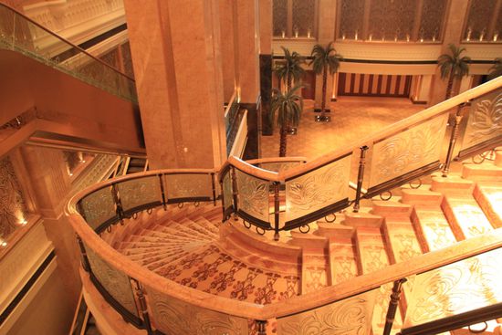 Am Emirates Palace angekommen mussten wir am Eingang unsere Reservierung vorzeigen, ohne die wir sonst keinen Zutritt bekommen hätten. Ein kleiner Exkurs zum Emirates Palace. Das 7-Sterne Hotel ist die direkte Antwort Abu Dhabis auf das Burj Al Arab in Dubai. Die Vormachtstellung sollte damit wieder gerade gerückt werden, was in Sachen Größe und Kosten wohl auch gelungen ist. Die markante Architektur kann das Nobelhotel jedoch bei weitem nicht bieten und so bleibt das Burj Al Arab weiterhin das Wahrzeichen der Emirate. Um auf die Größe des Emirates Palace zurückzukommen. Wollte man das Gebäude einmal umrunden, würde das einen Fußmarsch von 2,5 km bedeuten. Es gehört zu den 5 größten Gebäudekomplexen der Welt und die Kuppel in der Mitte ist größer als die des mächtigen Petersdoms in Rom. Die ganzen Ausmaße haben, wie hier üblich, immer nur gigantische Angaben. Natürlich ist es schon ein tolles Gefühl, wenn man die lange Auffahrt zum Haupteingang gefahren wird, einem dann die Tür geöffnet wird und man in die riesige Eingangshalle eintritt. Hier wirkt alles sehr gediegen, Palmen sind im Lichthof arrangiert und alles, was wie Gold ausschaut, IST auch tatsächlich Gold. Das sahen wir am praktischen Beispiel, als ein Stuckateur die hauchdünnen Blattgoldschichten großflächig an der Decke verteilte. Neben ihm stand natürlich ein Mann der Security, damit die wenigen Gäste und Touristen sich nicht vom herab fallenden Gold bedienten. Vermutlich ging es mehr um die Touristen, als um Gäste des Hotels, denn die dürften es angesichts der Zimmerpreise nicht nötig haben. Das günstigste Zimmer ist für 1000 US$ die Nacht zu haben. Immerhin ist dann ein eigener Butler inklusive.