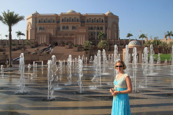 Gut. Was stand heute auf dem Programm? Nicht wirklich viel. Da wir beide schon einige Tage zuvor hier in der Stadt waren, mussten wir uns nicht die Highlights der Stadt nochmals anschauen. Also hieß es ausschlafen, in aaaaller Ruhe, endlich einmal, frühstücken gehen, ein bisschen lesen auf einem recht leeren Sonnendeck und am Nachmittag dann entspannt zum Höhepunkt des Tages gefahren werden, der Teatime im Emirates Palace. Nach dem Transfer vom Schiff zum Hafenausgang wurden wir sofort belagert von Taxifahrern, die uns für "nur" 20 EUR!!! die 8km bis zum Hotel chauffieren wollten. Nachdem wir hier die Preise kennen und uns daraufhin abwandten, besannen sich die dreisten Taxifahrer meistens plötzlich, dass es doch nur 10 EUR wären. Nun wir gingen einfach und 3 Meter weiter stand ein unauffälliger und unaufdringlicher Taxifahrer, der bereits sagte, dass er mit Taxameter fährt. Alles in allem haben wir somit denn 17 Dhs (rd. 3,50 EUR) gezahlt, ihm dann aber 25 Dhs gegeben, weil er uns vor den "Abzocktaxis" gerettet hat.