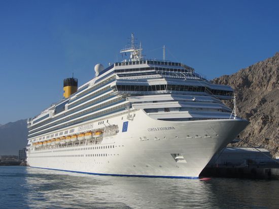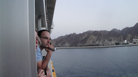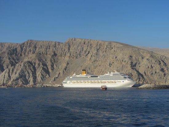 Wir wachten gerade auf, als unser Schiff in den winzigen Hafen der Stadt Khasab einlief und das komplette Pier belegte. Das Schiff war an diesem Tag das mit Abstand höchste Gebäude weit und breit. In Khasab ist eigentlich nicht wirklich viel los. Es kam ja auch erst als Ersatz für Bahrain zum Zuge. Wir hatten die Wahl, auf dem Schiff zu bleiben oder einen der Ausflüge mitzumachen. Wir entschieden uns für Letzteres, was bedeutete, dass wir bereits um 7:30 Uhr (!!!) vom Schiff gingen = 5:45 Uhr aufstehen. Uiiii...und das nach den Absackern gestern.