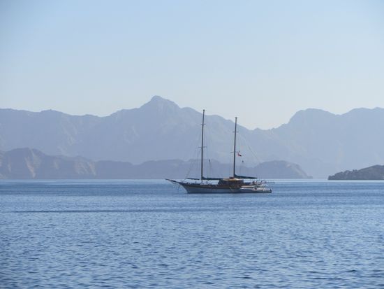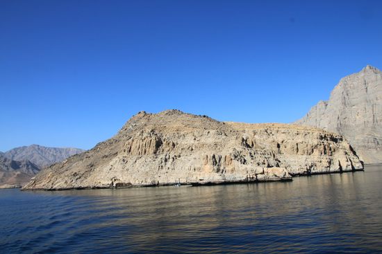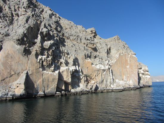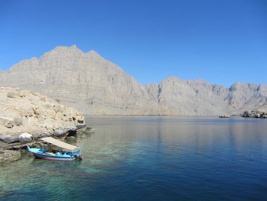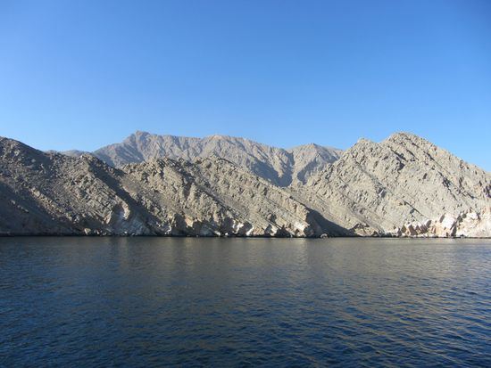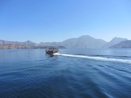 Eine Hammelherde an Touris, die den gleichen Plan hatten, waberte von Schiff und bestieg gleich das nächste Schiff, eine größere Dhau. Damit fuhren wir in die Schluchten und Fjorde der Region, die auch "das arabische Norwegen" genannt wird. Die Landschaft ist irgendwie seltsam. Wasser, extrem schroffe, rötlich schimmernde Felsen und Berge und kaum Vegetation. Die Region um Khasab ist vor allem bekannt für das Schmuggeln von Waren, das auch heute noch rege betrieben wird. Der "Handel" läuft zwischen dem Iran und dem Oman.