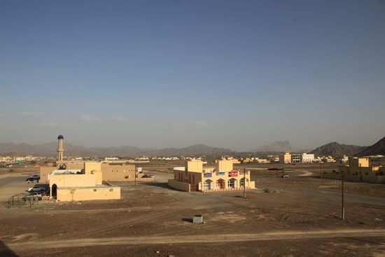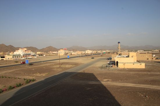 Das angeschlossene Fort, der ehemalige Herrschersitz, war leider wegen Umbaumaßnahmen geschlossen. Schade, denn hier kommt die Familie des Scheichs her, der aktuell Dubais Regierung stellt. Auch der Aussichtsberg, der einen schönen Blick über die Stadt versprach, war wegen Baumaßnahmen nicht zu erreichen, so dass wir unvermittelt weiter Richtung Oman fuhren. Den Tank gefüllt und die Brieftasche voller Dirham zuckelten wir mit den üblichen 100km/h zur Grenze. Die Spannung stieg, denn wir benötigten ja noch ein Visum. Da wir keine Ahnung hatten, wo wir das bekommen würden, verhielten wir uns wahrscheinlich noch auffälliger als ohnehin schon und klopften an fast jedes Fenster, hinter dem ein Mensch saß. Die Emiratis bei der Ausreise wollten unsere Unbedenklichkeitserklärung zur Mietwagenmitnahme sehen, die wir uns gestern noch von Dollar Rent a Car geholt hatten. Am Ende fanden wir dann auch die Einreisebehörde. Hier füllten wir schnell ein Formular aus, hielten wieder unsere Unbedenklichkeitserklärung der Autovermietung hin und sollten noch die Kreditkarte rüberwachsen lassen. Offiziell sind 20 OR zu zahlen (40 Euro pro Nase). Da Hendi einfach mal nachfragte, ob denn auch Dirham funktionieren würden, wurde erst gezögert, dann aber eher überlegend gesagt, na dann geben sie mir 100 Dirhams (25 Euro für beide). Wir wissen bis heute nicht genau, ob die uns übers Ohr gehauen haben, denn nicht unoffensichtlich, lachten sie über uns, als wir auf dem Weg nach draußen waren. Laut Reiseführer sind für das Visum in den Oman aber 20 Rial pro Nase fällig, was bedeutend mehr als 100 Dirham sind, also glauben wir, einen Schnapp gemacht zu haben.