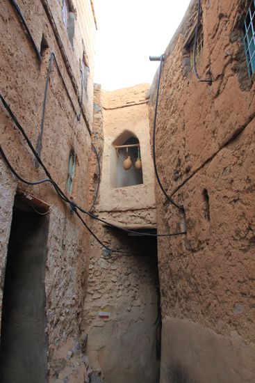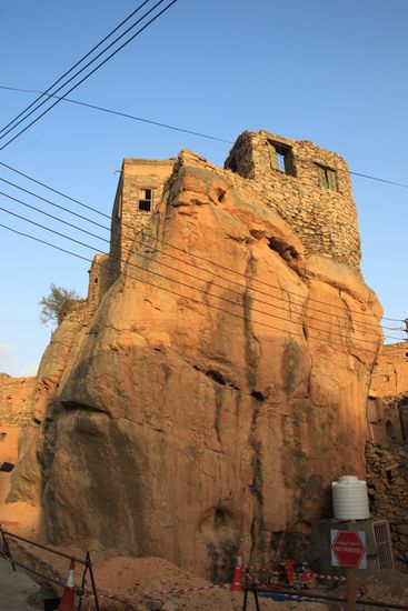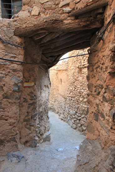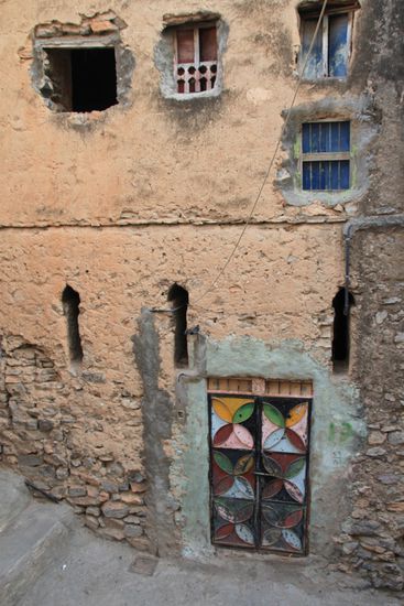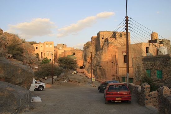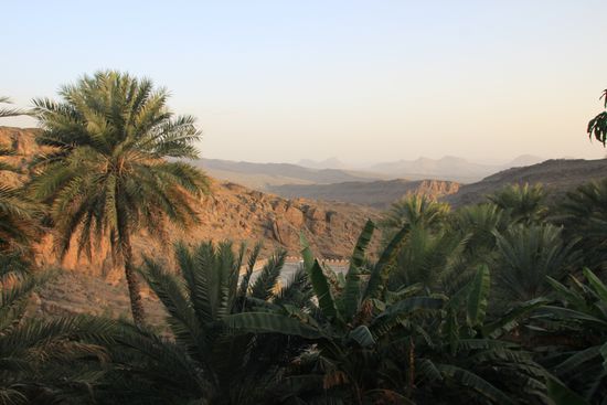 Wir zuckelten also weiter dahin, bis Hendi plötzlich "aufschrie": "... da ist doch unser Hotel oder?" Tatsächlich stand es da einfach so an der Straße, fast mitten im Nichts erschien es riesig groß mit seinen 4 Etagen, es gab keinen asphaltierten Zugang also hart rechts einschlagen und ab über die Schotterpiste. Das Hotel ist echt gut (Jibreen Hotel in Bahla, 38 RO pro DZ). Vermutet man so gar nicht. Sehr sauber, technisch auf dem letzten Stand und freundliches Personal gab's oben drauf. Über free wifi freuen wir uns auch immer sehr! Nun hatten wir noch etwas Zeit bis zum Sonnenuntergang, die wir dazu nutzten, nach Misfah zu fahren. Das Dorf oberhalb von Al Hamra soll angeblich das schönste Dorf des Oman sein. Eine steile Serpentinenstraße später standen wir auf einem Berghang, die Straße endete in einem winzigen Dorf und wir waren da. Hier bietet sich ein wunderbarer Ausblick über die karge Steinwüste, mit ihren kleinen Oasen und den bis auf über 3000 m (!!) hohen Bergen, die eher an einen gigantischen Canyon erinnern. Die untergehende Sonne spendete uns hervorragendes Licht für beeindruckende Landschaftsbilder. Misfah selbst wirkte total ausgestorben, die Häuser teilweise unbewohnt, aber trotzdem gefiel es uns total gut mit seinen Lehmhäusern und der Ursprünglichkeit, weitab von den Touristenpfaden.