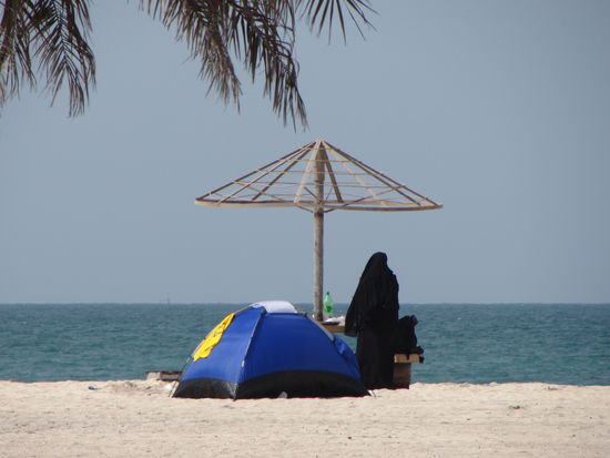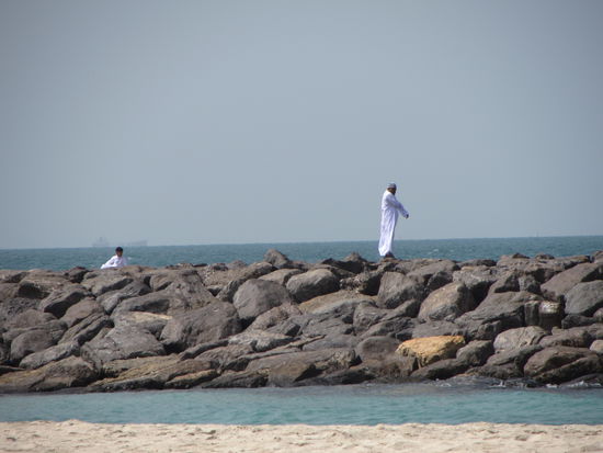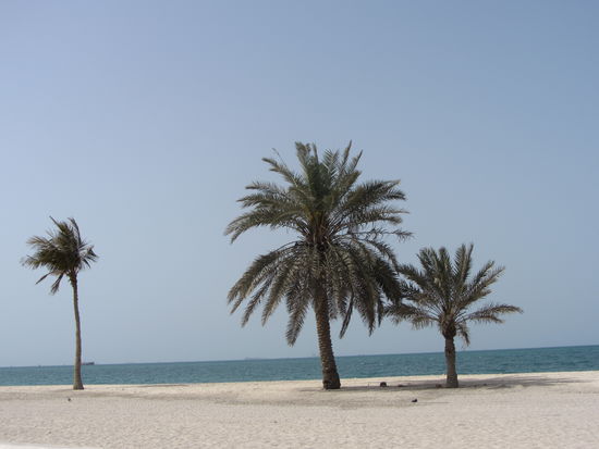 Heute war es nun soweit. Der Tag des Einschiffens. Klingt komisch, ist aber so. Die Zeit zuvor nutzten wir jedoch noch, um unsere Individualreise-Bedürfnisse zu stillen. Nur wir zwei mit unserem Auto. Also wurde recht früh ausgecheckt und auf ging's mit Sack und Pack in nördliche Richtung der Vereinigten Arabischen Emirate. Erstes Ziel war das nördlichste Emirat Ras Al Khaimah, das eigentlich keine spektakulären Sehenswürdigkeiten bietet. Allerdings ließen wir uns hier nicht die Möglichkeit nehmen, mit dem Auto direkt an den Sandstrand zu fahren. Ein lustiges Fahrgefühl. Da kaum sonst jemand da war, haben wir schicke Fotos schießen können. Lediglich ein paar kleine süße Kinder, die mit ihrer verschleierten Mutter am Strand saßen, kamen gleich angelaufen und betrachteten Hendi erstaunt. Blonde Haare sind hier eben eher selten.