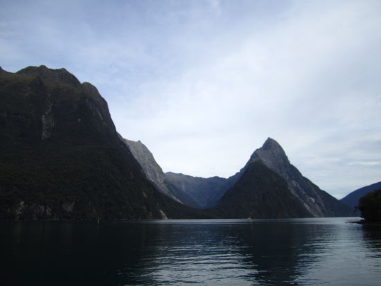 Die Anfahrt selbst ist wunderschön, die Wälder und Berge ein Augenschmaus und die Bootsfahrt eine salzige und willkommene Abwechslung. Bei Regen verwandelt sich Milford Sound in eine Fjordlandschaft voll mit Wasserfällen. An dem Tag, wo ich unterwegs bin, ist von allem ein bisschen dabei. Ein bisschen Nebel und düstere Stimmung, Wind, Sonnenschein sowie Seals, Pinguine (die ich leider nicht wirklich sehe) und riesige Delphine, die unser Boot lange begleiten.