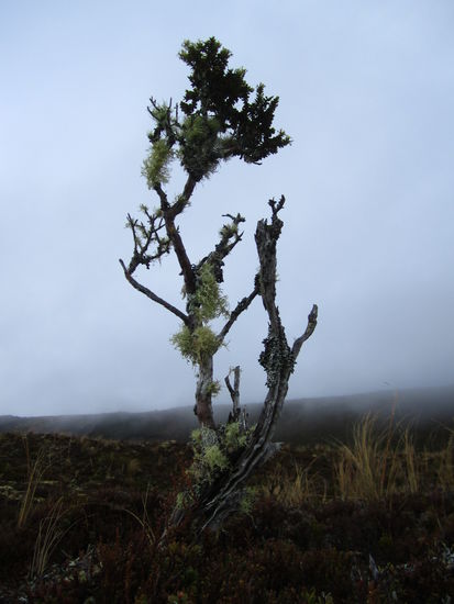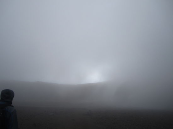 Wieder gehts bergauf und nun stockt uns allen mehr oder weniger das Blut. Der Wind ist eiskalt und es stürmt. Man sieht kaum zwei Meter weit. Die Erde ist nass und rutschig und links und rechts gehts steil berg ab. Die Menschen schützen sich selbst mit wetterfester Kleidung, die allerdings eine noch großere Angriffsfläche für den Wind bietet. In der Folge verstecken sie sich hinter Felsen oder halten sich an ihnen Fest, um nicht verblasen zu werden. Wirklich! Eine Windböe und ich finde mich selbst um über einen Meter auf die Seite gedrängt. "Es gibt Regeln fürs Wandern. 1. Bei so einem Wetter hat man nichts am Berg verloren. 2. Bei so einem Wetter hat man gar nichts am Berg verloren. 3. Bei so einem Wetter hat man ganz und gar nichts am Berg verloren. ..." Nicht nur ich bin verzweifelt. Ich schließe mich bei anderen WandererInnen an, um ja nicht allein zu gehen und friere mir wirklich fast die Finger und die Nase ab.
