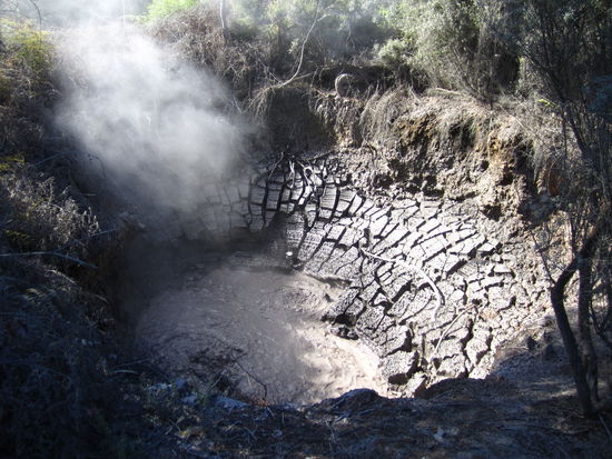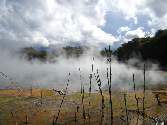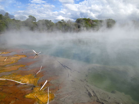 Es gibt hier einen Park, der blubbert und stinkt. Rotorua befindet sich in einem vulkanisch aktiven Gebiet und hier kann man heiße Quellen und nach schwefel stinkende Seen hautnah erleben. Spannend ist, dass auch Häuser auf dieser Linie stehen und bei jedem dieser Hütten oder Villen kommt irgendwo im Garten ein Rohr aus dem Boden, das stinkenden Dampf entweichen lässt. Stinkend aber praktisch, denn diese Energie auch tatsächlich für das alltägliche Leben genutzt!