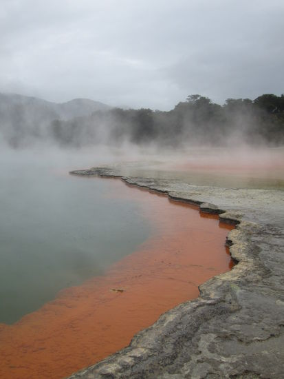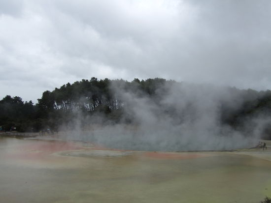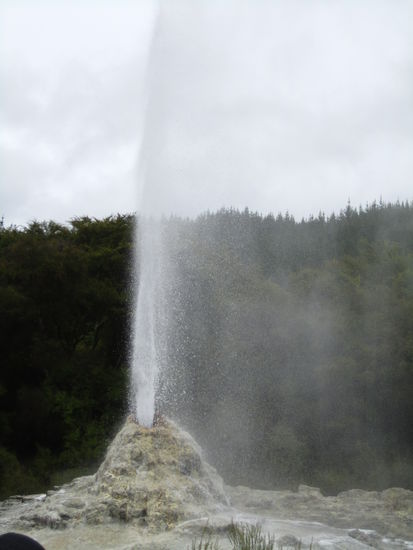 Zu Lady Knox, ein Geysir, der jeden Tag mit Baking-Soda gefüttert wird, damit er pünktlich um 10:15 für die Touristen sein heißes Wasser sprühen lässt, nimmt mich ein sehr liebes deutsches Pärchen mit (isch 'abe ja kein Autoooooooo). Die Show dauert mit Ansprache ca. 20 Minuten und ist recht lustig anzusehen. Der Geysir selbst ist weit weniger beeindruckend .