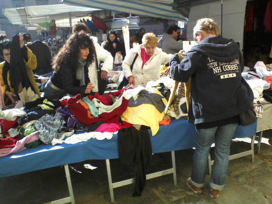 , Markt( Die Second Hand Wühltisch Klamotten Händler nehmen immer mehr zu )und anschließender Cappuccino bei Marko im Jazz Club .Die Damen und der Herr Hahn im Korb David von Books for Dogs sind alle versammelt. Aproppo Markt . Second Hand Klamotten sind hier Altkleidersammlungs Klamotten bei denen du echt ein paar super Schnäppchen machen kannst . 3,5 10 oder nur 1 Euro . So lauten die Schilder mit vor den Ständen und da geht was . Mit ordentlich anpreisen . Da liegen 501 Jeans neben Trachten Janckern , Boss Hemden neben Kerweborschen Shirts aus Dellenbroich und Lidl Auszubildenden
