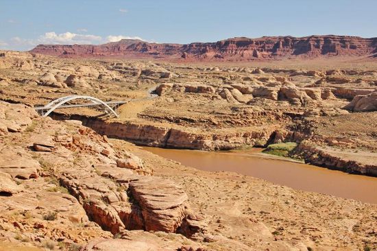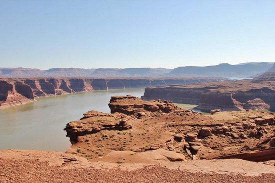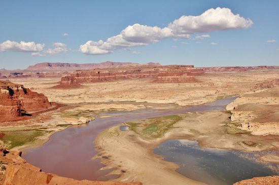 Mit der Fertigstellung des Glen-Canyon-Staudamms wurde der Glen Canyon ab dem 13. März 1963 vom Colorado überflutet und bis zum 22. Juni 1980 zum Lake Powell aufgestaut. Benannt wurde er nach dem Bürgerkriegsveteranen Major John Wesley Powell, der im August 1879 mit acht weiteren Männern den Glen Canyon erforschte. Heute ist der See nach dem Lake Mead (Nevada/Arizona) der zweitgrößte Stausee der Vereinigten Staaten. Bei maximaler Stauhöhe hat er eine Länge von rund 300 km, ist am Damm 171 m tief und bedeckt eine Fläche von 653 km² (auf Seespiegelhöhe von 3.700 Fuß - 1.127,76 m). Mit rund 33,3 Milliarden m³ (= 33,3 km³) Wasser überflutet der Lake Powell dann 96 Canyons und erstreckt sich weit in die Mündungen des von Nordwesten her kommenden Escalante River sowie des von Osten her kommenden San Juan River. Die Küstenlinie des Sees ist mit 3.153 km (1.960 Meilen) länger als die gesamte Westküste der USA.