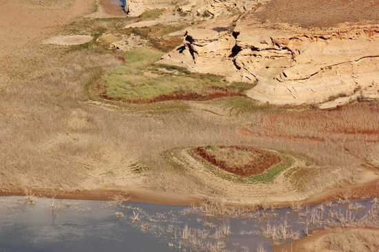 Nach sechs niederschlagsarmen Jahren und intensiver Wasserentnahme (u.a. aus Las Vegas) ist der Pegel bis zum Sommer 2005 um etwa 45 m gesunken, was rund zwei Drittel des ursprünglichen Wasservolumens entspricht. Durch den Rückgang sind breite Strände entstanden, die Enden der äußeren Canyons sind trocken gefallen. Die Rainbow Bridge ist vom Ufer her nur über einen längeren Fußweg zu erreichen und es sind Felsformationen aus dem Wasser aufgetaucht, die seit 30 Jahren nicht mehr zu sehen waren.