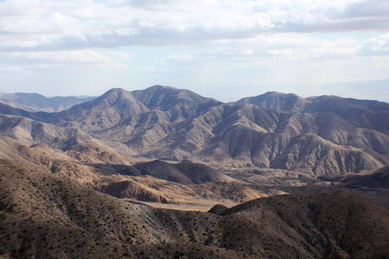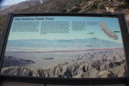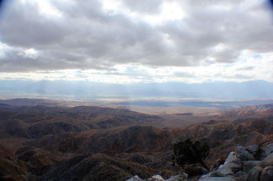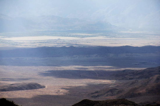 Der 1581 m hohe Aussichtspunkt Keys View...; hier oben zieht es kalt und windig wie durch einen Kamin...; das graue Band im Talboden ist die Andreas Verwerfung...