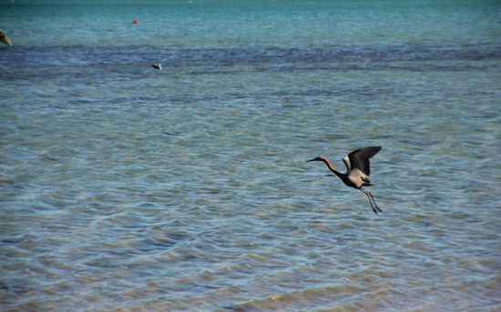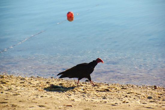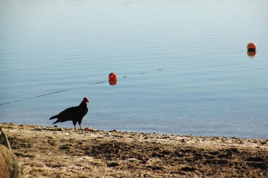 Doch da hat sich ein Geier angeschlichen...; obwohl die Möve ihre Mahlzeit mit lautem Gekreische verteidigt...
