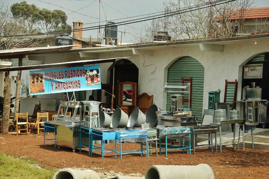 Der weitläufige Gebäudekomplex gehört der Sozialversicherung Mexicos IMSS. Auf Grund der ausgestellten Maschinen dürfte früher hier eine Textilfabrik gewesen sein...; wir verbringen zwei ruhige Nächte - sind wir auf dem CP doch die einzigen Gäste...