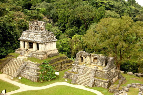 Wir begeben uns zu einer andern Tempelgruppe...; rechts im Bild der Tempel des Kreuzes, links der Sonnentempel und dazwischen der Tempel XIV...
