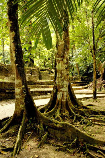 Hinauf zum Tempel des Kreuzes, dem Gott G-1 der Triade von Palenque geweiht...; über der dritten Terrasse des Unterhauses befanden sich Räume mit Gräbern von Adligen...; auf der Westseite wurde eine grosse Anzahl von Weihrauchgefässen mit Figuren gefunden...