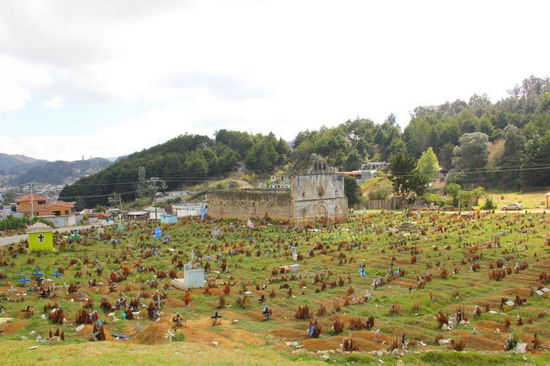 Auf dem Friedhof von San Juan Chamula...; die schwarzen Kreuze zeigen an, dass ein alter Mensch - die weissen ein junger Mensch - verstorben ist...; die Flaschen sind Tranksame in den traditionellen Farben für die Verstorbenen...