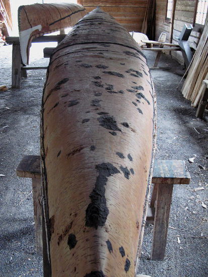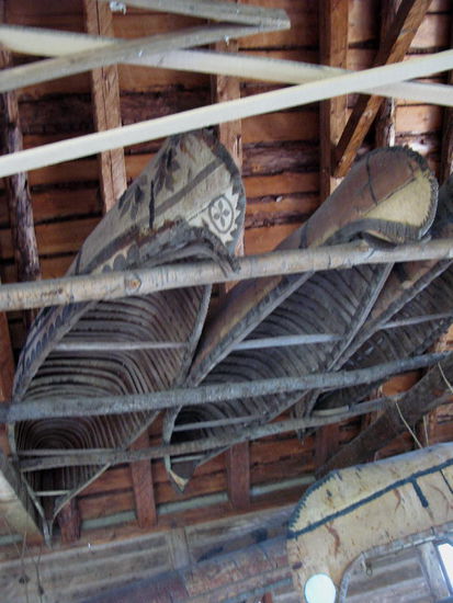 Das Innenleben...; am Boden Tannenreisig, darüber Tierfelle...; fürs Winterquartier wurde innen eine 2. Schicht Birkenrinde aufgezogen, dazwischen eine Isolation aus Moosen und Flechten...; in der Mitte das wärmende Feuer...