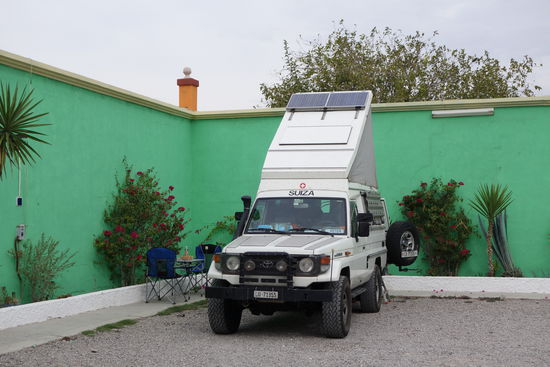 In Bermejillo, ca. 30 km ausserhalb der Stadt Torréon finden wir bei einem Hotel einen ruhigen Platz zum Übernachten... Rund 370 km haben wir heute hinter uns gebracht...