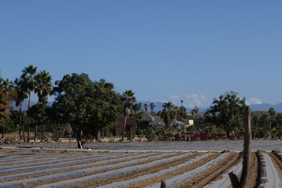 Die Strasse - resp. der Feldweg führt uns hinaus durch landwirtschaftlich genutzte Flächen, hier im Bild werden wohl Erdbeeren angepflanzt! Das Haus, in welchem wir die Aufzuchtanlage vermuten, finden wir zwar nahe am Pazifik! Leider ist es geschlossen und sogar zum Vermieten ausgeschrieben! Etwas enttäuscht fahren wir zurück, fragen unterwegs noch einen Bauern am Wegesrand! Er meint "Ya no"! - "jetzt nicht"!