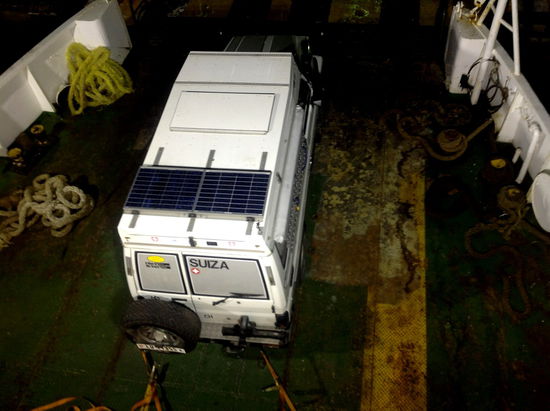 Um acht Uhr geht es los, der Kapitän will noch die Pässe sehen, zuvor hatte der Zoll noch die Fahrgestellnummer von Leomobil kontrolliert. Alles ok, rückwärts über die Rampe zum Schiff...! Das Auto wird festgezurrt, alle Passagiere sind an Bord! Wir verlassen die Baja California...