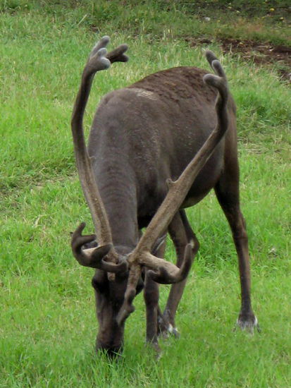 Das Karibu - wie die Uni-Mitarbeiterin uns erklärt, gibt es einen Unterschied zwischen Ren und Karibu - obwohl Wikipedia nur einen geografischen Unterschied macht...; das Karibu ist etwas kleiner und hat eine andere Stirnschaufel...; beide Tierarten gehören zur Familie der Hirsche - übrigens auch die Elche...