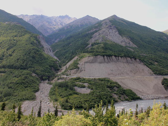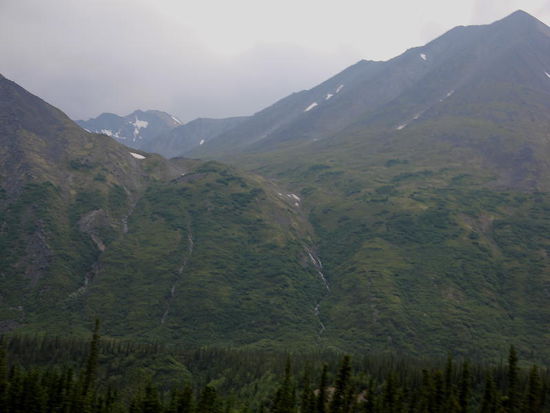 Tiefe furchen im Gebirge...; wir besuchen das Reservationszentrum und müssen zur Kenntnis nehmen, dass heute alles ausgebucht ist...; wir fahren noch weiter zum Reservationsbüro der Parkverwaltung; der Denali NP darf nur auf den ersten 22 Meilen privat befahren werden, es gelten wegen der hohen Besucherzahl - mittlerweile sind es pro Saison über 600'000 - Restriktionen. Man könnte Fahrten mit Bussen in den Park unternehmen - die Preise allerdings sind auch nicht ohne!