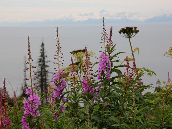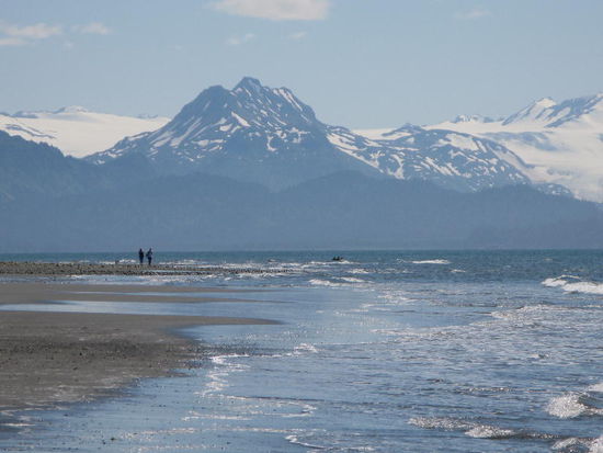 Wir fahren Richtung Homer...; auf der andern Seite der Bucht tauchen die hohen, schneebedeckten Berge auf...