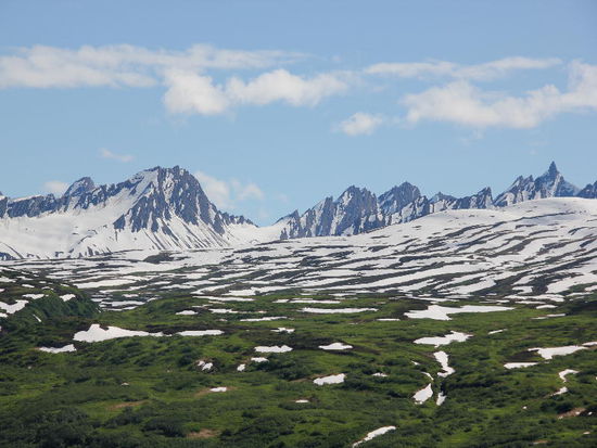 Immer noch verschneite Berge...; und Ende August beginnt es wieder zu schneien...; kühl war's auch - gefühlte Temperatur max. 15°C...; unterwegs hat uns ein Ehepaar beim Einkauf in einem abgelegenen Laden erzählt, sie hätten im vergangenen Winter 10 m Schnee gehabt...; die Elche seien im Schnee über dem Hausdach gelaufen...!!! Hoffentlich stimmt's...!