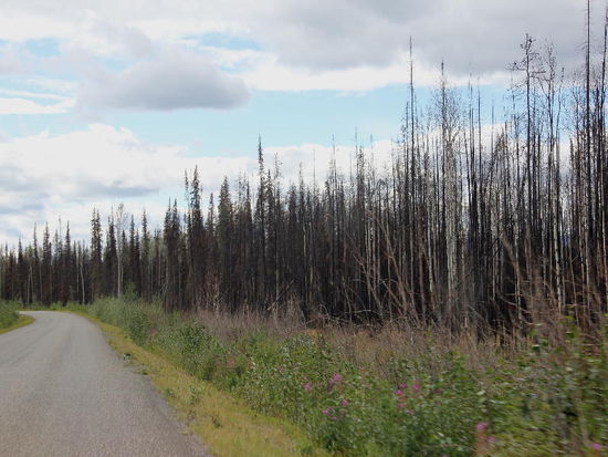 Kilometerlange Waldbrandgebiete...; die Waldbrände werden nur bei Siedlungen bekämpft, ansonst dienen die Brände auch der Walderneuerung...!