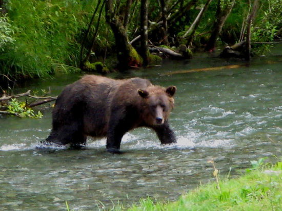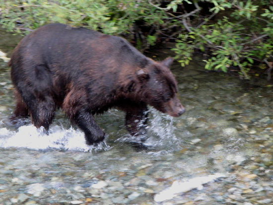 Wieder unten an einem Seitenkanal erleben wir ein richtiges Naturschauspiel...; ein Grizzly watet durch den Fluss...