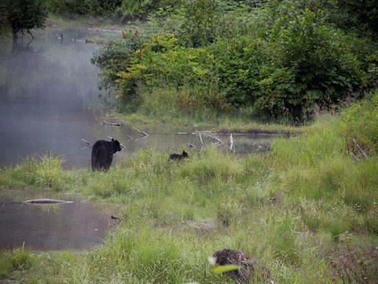 Eine Schwarzbärin mit ihrem Jungen schleicht dem kleinen See entlang...; leider erschrickt sie durch mein Blitzlicht und sucht den Rückzug...