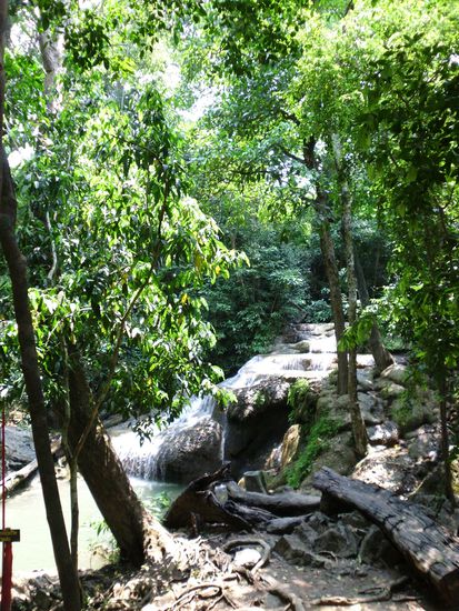 Am ersten Abend in Kanchanaburi lernte ich sofort ein Maedchen aus Deutschland im Internetladen kennen. Die ersten Abende hatten wir zusammen auf dem Nachtmarkt und in einer Bar verbracht. Heute sind wir dann zusammen in den Erawan Nationalpark gefahren. Es ist ein total schoener Nationalpark mit vielen Wasserfaellen aber leider ist das wohl DER Geheimtipp in irgendeinem russischen Reisefuehrer. Leider konnten wir dementsprechend nicht so ausgiebig die Natur geniessen aber es war trotzdem ein schoener Tag.