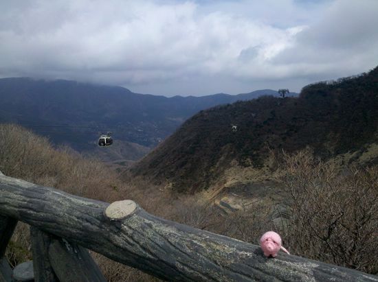 Hakone wird am nächsten Tag per Round Trip mit allen möglichen Verkehrsmitten erkundet. Erst geht es mit dem Bus nach Gora von wo aus wir per Cabel-Car-Bahn zum ersten Aussichtspunkt gebracht werden. Von dort aus steigt man in eine Seilbahn um erst auf dem Berg einen weiteren Aussichtspunkt zu bestaunen und anschließend in die nächste Seilbahn zu steigen. Hier kann Denise wieder Stempel sammeln.