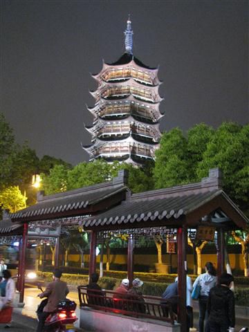 Heute Morgen gehen wir am Bahnhof vorbei und wenden uns dann nach Süden, denn wir wollen unsere Stadtbesichtigung mit der Nordtempel-Pagode (Bei Si Ta, E = RMB 25) beginnen. In dieser 9 stufigen Pagode kann man innen über 230 Stufen die 76m hochsteigen und zur Belohnung dann von dort droben einen herrlichen Rundblick auf Suzhou geniessen.