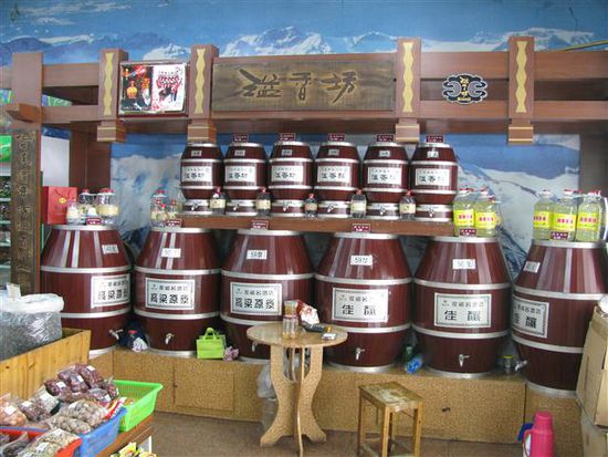 Hier wird ein Schnaps verkauft, der aus den 5 Getreidesorten Mais, Reis, Hafer, Weizen und Roggen hergestellt und dann vor dem Verkauf erst einmal noch 3-7 Jahre lang gelagert wird. Vom Geschmack her gleicht dieser hier sehr dem namens-geschützten und in der Flasche ca. 5-8 mal teureren Original 'WuLiangYe' (=5 Getreide-Flüssigkeit).