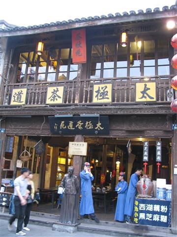 Hier wurde die Innenstadt bestens renoviert, die alte Imperial Road wurde zur Fussgängerzone mit offenen Wassergräben am Strassenrand rückgebaut. Die Läden am Strassenrand sind auf alt getrimmt, traditionell eingerichtet, teilweise wird wie in diesem Teehaus auch noch traditionelle Bekleidung getragen.