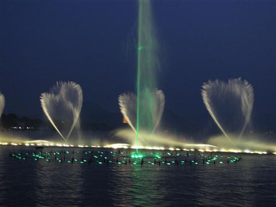 Wir haben es geschafft und unsere 23,8km Runde rechtzeitig zur Spritzwasser-Lichtschow beendet. Diesmal zur Einstimmung 'simply the best' mit Laserlicht auf einer Wasserwand und danach 15 Minuten lang tanzende Fontainen zu chinesischen Liebesliedern unter dem Sternenhimmel am Westsee....