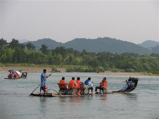 Irgendwann haben wir auch dieses Dorf abgelaufen und kehren nach Yantou zurück. Wir durchqueren wieder einmal den Ort und gehen nun zur 'zweiter Brücke' am Nanxi Fluss. Dort am jenseitigen Ufer die nächste Touristenattraktion, man kann sich auf Bambusflössen den Fluss hinunterschippern
