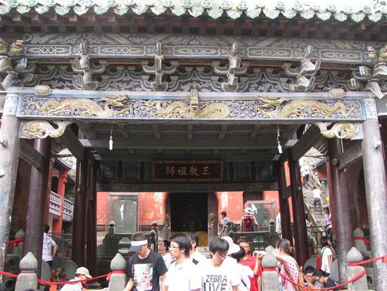 Unserer Wanderziel, der Gipfel auf 1612m ist erreicht, wir steigen auf der Qing Strecke in einem relativ einfachen Treppenhaus wieder ab, stossen nach den 100 Stufen in der Nähe des Chaotian Tempel wieder auf den Herweg, besuchen noch kurz den Bethel-Nuss Tempel, in dem insbesondere Zhang San Feng,