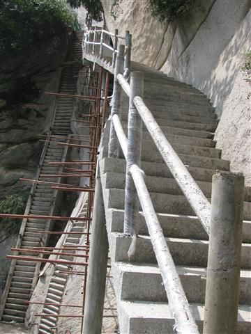 Hua Shan, einer der fünf heiligen Berge des Taoismus, ein von Gletschern geschliffener Granitklotz mit 5 Gipfeln (Nord-Ost-Süd-West und Mittelgipfel) und über 1000m hohe Steilwänden, sofort werden Erinnerungen an Yosemite wach. Hua Shan könnte das Paradies für Free-Climber sein, aber anscheinend wird dieser Sport hier nicht ausgeübt. Hua Shan hat den Ruf ein gefährlicher Berg zu sein, aber mittlerweile sind die kritischsten Stellen wie die 50m hohen senkrechten Aufstiege am Weg der Soldaten und der Aufstieg mit leichtem Überhang durch neu an den Fels betonierte Treppenhäuser entschärft, (Bilder dazu weiter unten) für den Abstieg zum Chess-Pavillion und zum Plank-Walk muss ein einfacher Brustgurt mit 2 Karabinerhaken (jedoch ohne Sturzbremse wie bei einem echten Klettersteigset) gemietet werden. Bei starken Regen wird der Berg gesperrt, bereits gelöste Eintrittskarten werden dann ggf. zurückerstattet. Um die Massen auf dem Berg besser zu verteilen ist derzeit eine zweite Seilbahn mit einer Bergstation zwischen Süd- und Westgipfel in Bau, Fertigstellung am 01.10.2012.